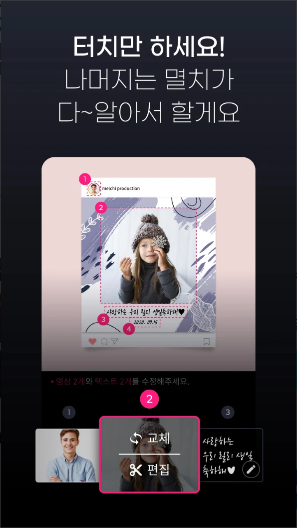 간단하게 버튼 몇 번을 누르는 것만으로도 전문업체 수준의 행사/기념일/광고 영상(사진)을 쉽게 제작할 수 있어요