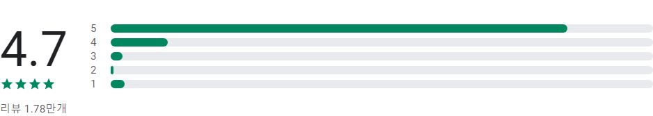 Play 스토어의 앱 평점 및 별표 1, 2, 3, 4, 5개 리뷰의 개수에 따라 표시되는 막대그래프는 앱의 평가 횟수가 매우 적은 경우가 아니라면 사용자 리뷰의 전체 기간 평균값이 아닌 앱의 현재 품질 평점을 바탕으로 합니다.