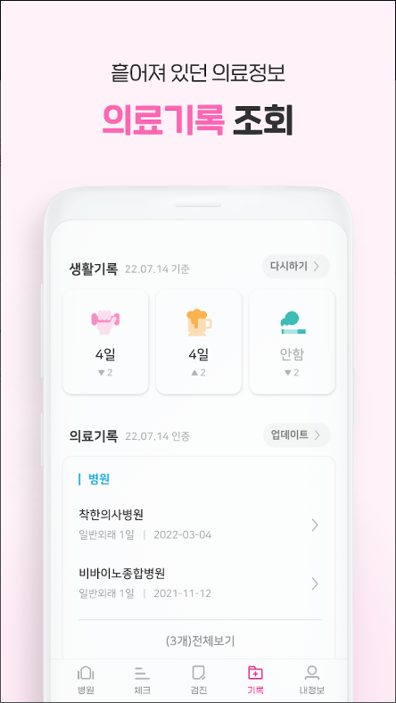 내 의료기록을 모바일로 조회하고 필요한 뉴스만 읽어보세요! 병원 방문기록, 약 처방내역, 검진결과 조회, 맞춤형 뉴스 추천까지.